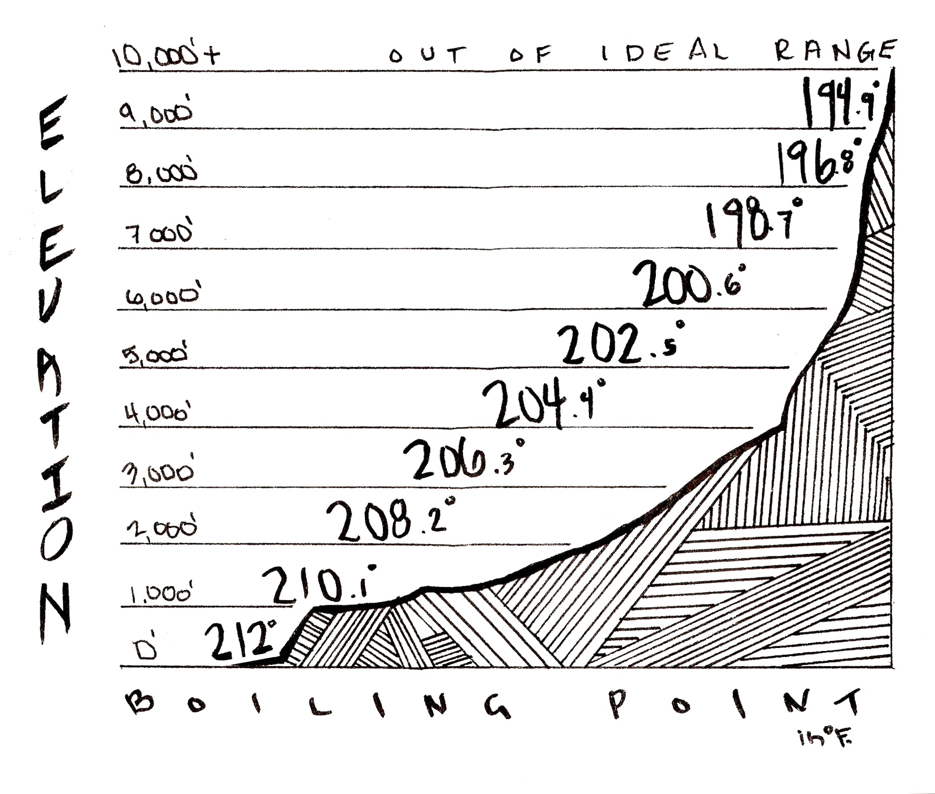 Because of decreasing atmospheric pressure, the boiling point of water drops two degrees for every 1,000 feet of elevation gain. If you don’t have a thermometer on hand, you may roughly gauge the right water temperature for coffee brewing with the chart above. Recall that the right temperature range for brewing coffee is between 195° and 205° F. When brewing between 0′ and 3,500′ in elevation, bring the water to a boil; then turn off the heat and wait about a minute for the water to cool into the ideal brewing range. Between 3,500′ and 9,000′ in elevation, the boiling point will be within the ideal range, so bring the water to a boil and use immediately. Above 10,000′ water boils at 193° and will produce an under-extracted cup. Use a pressure cooker to enable a higher boil, or drink tea.