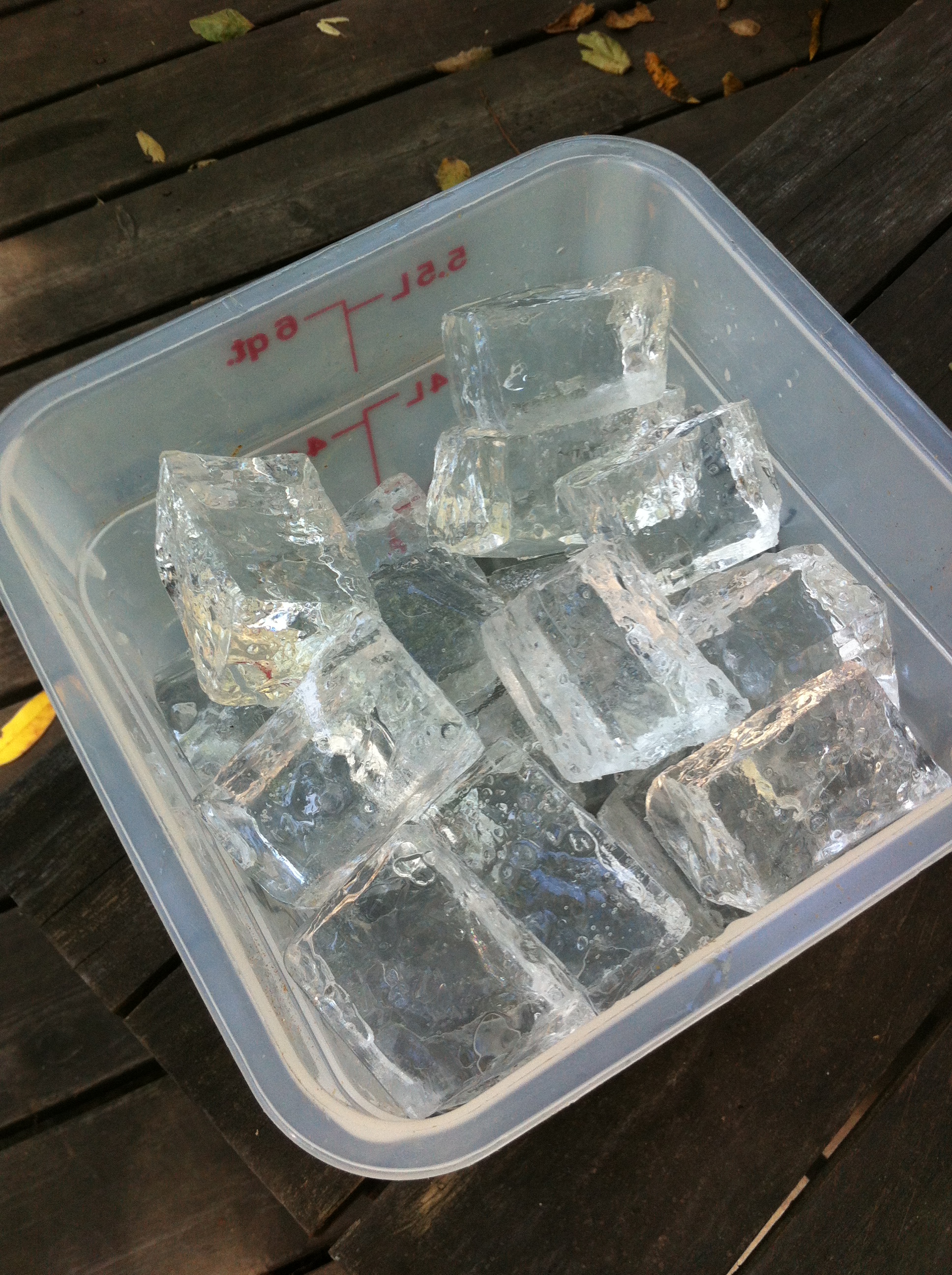 The following method for making clear ice in your freezer approximates the pond conditions, and insulates on all sides but the top. The result is a block that is half clear, half cloudy since all the bubbles will be pushed to the bottom of the cooler where they can’t escape. But it’s simple enough to carve the cloudy part away and make pieces of crystal clear ice with the rest.
