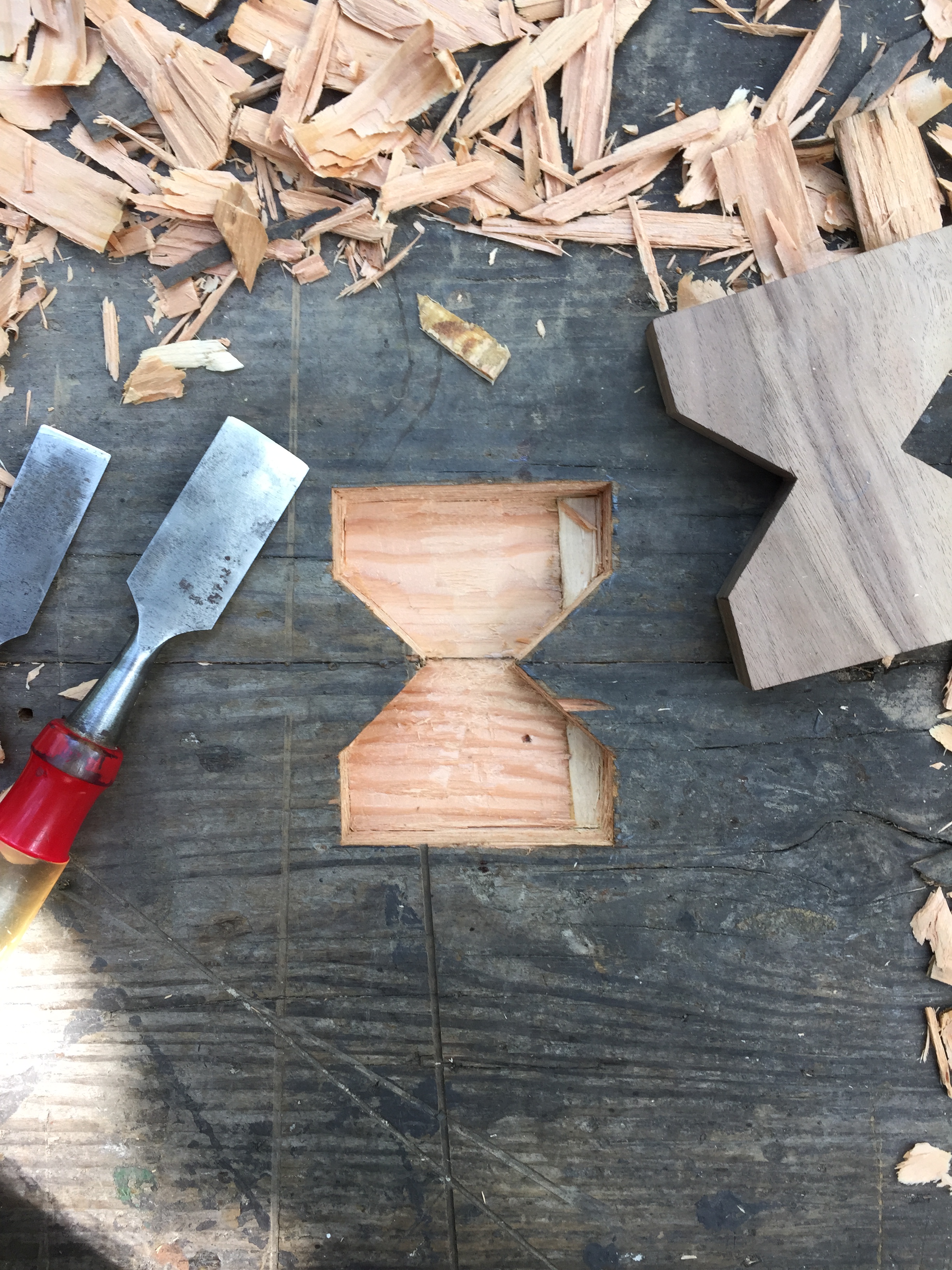 When kept surgically sharp, the chisel is an indispensable tool whose uses are numberless. Its mechanical design is a version of the inclined plane–one of the six simple machines. In the example above, it is being used to cut a mortise for a butterfly spline in an old Douglas Fir workbench. The top of the workbench is two 2×12 boards butted and doweled together. As the boards have swollen and shrunk over many years, the dowels no longer keep the joint together, but a few of these Walnut butterfly splines will prevent them from pulling apart.