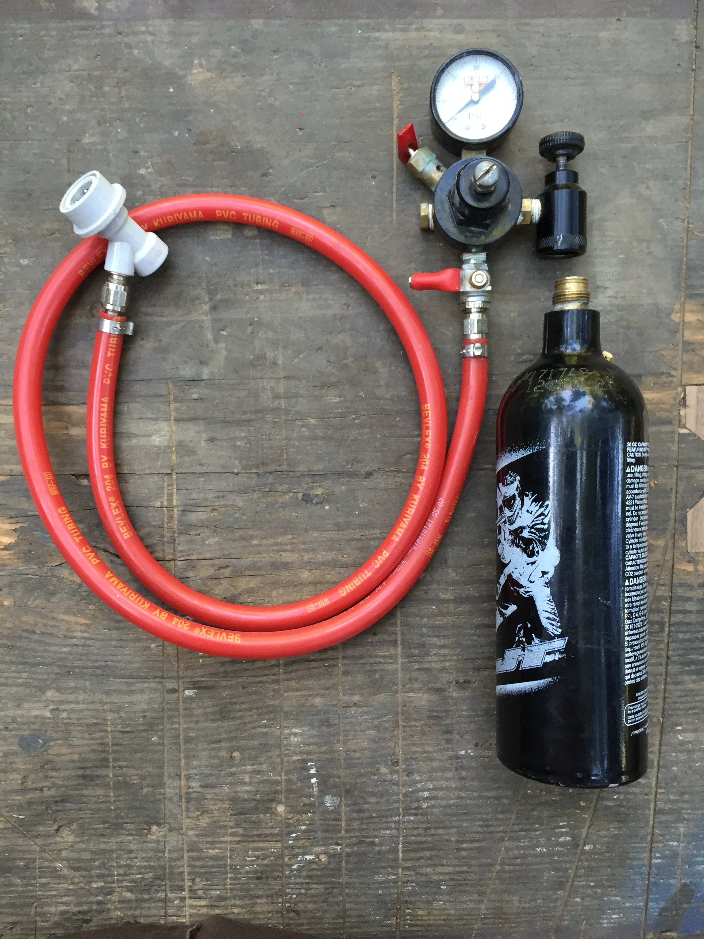 - 20 oz CO2 kit: it should come with a 20oz CO2 tank, a regulator, gas line, and a ball-lock gas connector (often gray or white). Get the CO2 tank filled at a scuba, paintball or home-brew supply shop.