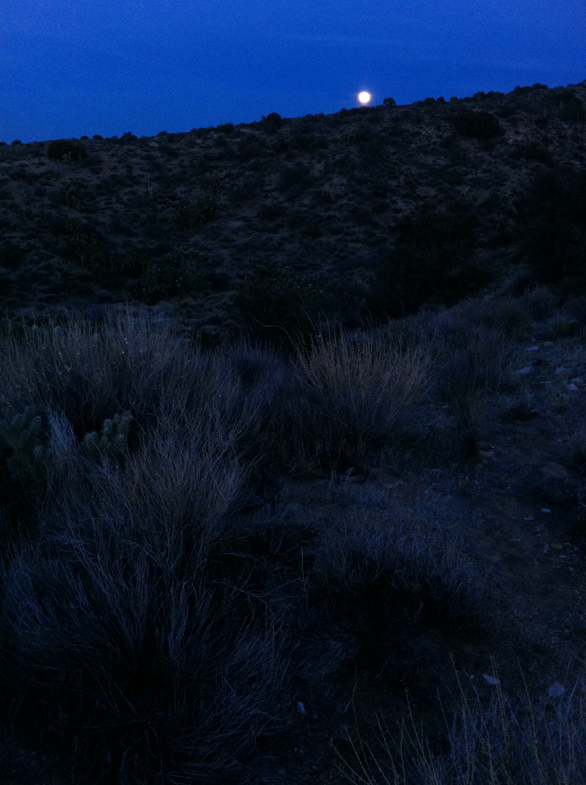 The sun goes down. The air between us and the near mountain becomes visible as a medium, a substance, a thing in itself, transparent but clearly four miles thick. The new, waxing moon, first quarter phase, shaped like a shield, hangs in the sky at approximately the same point occupied by the sun when we first stopped here.