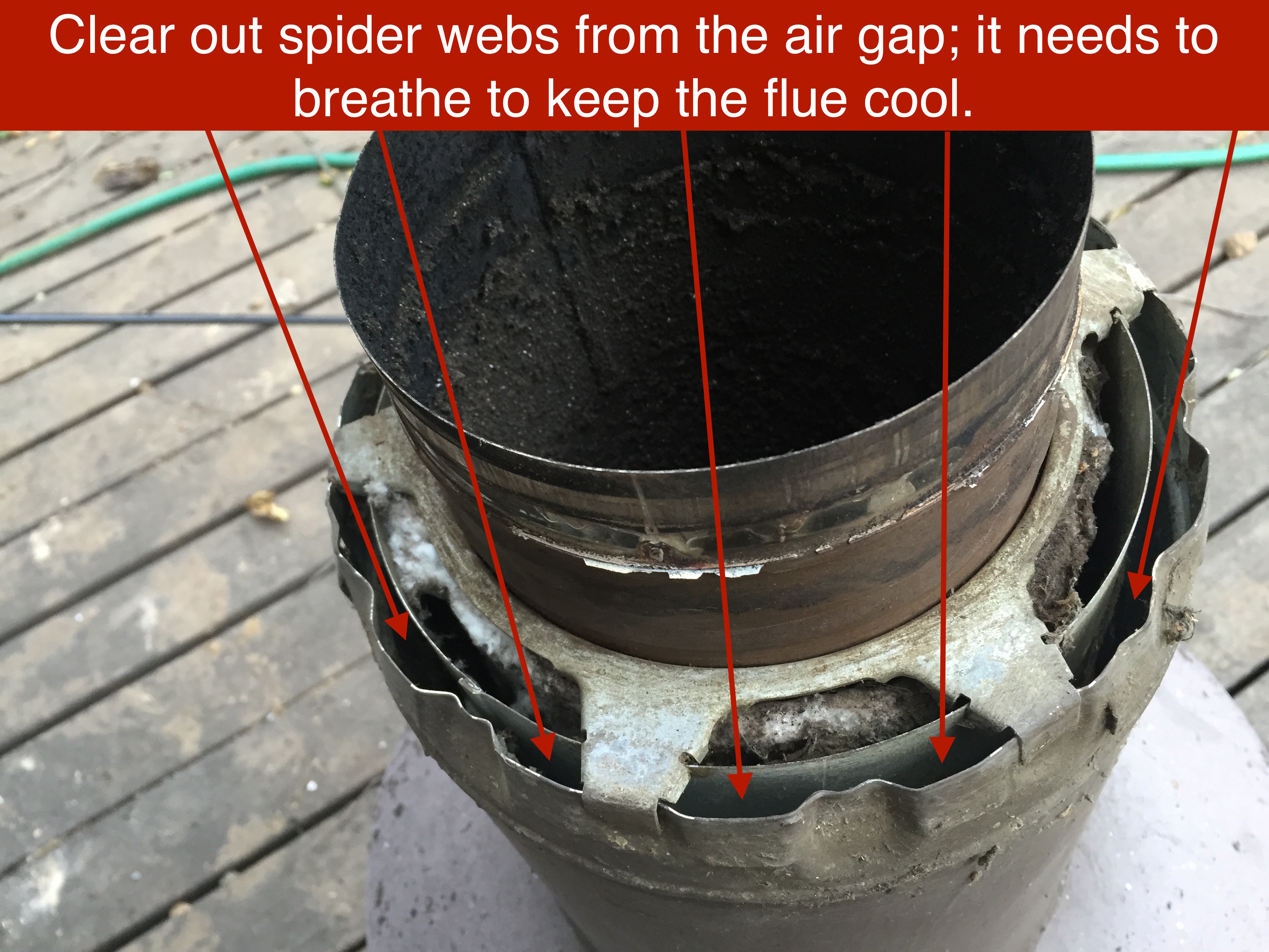 Now turn your attention to the spark arrestor and the roof jack. Clear out leaves, spider webs and brush creosote and ash away with a brass brush. Really reach in there and get all the surfaces.